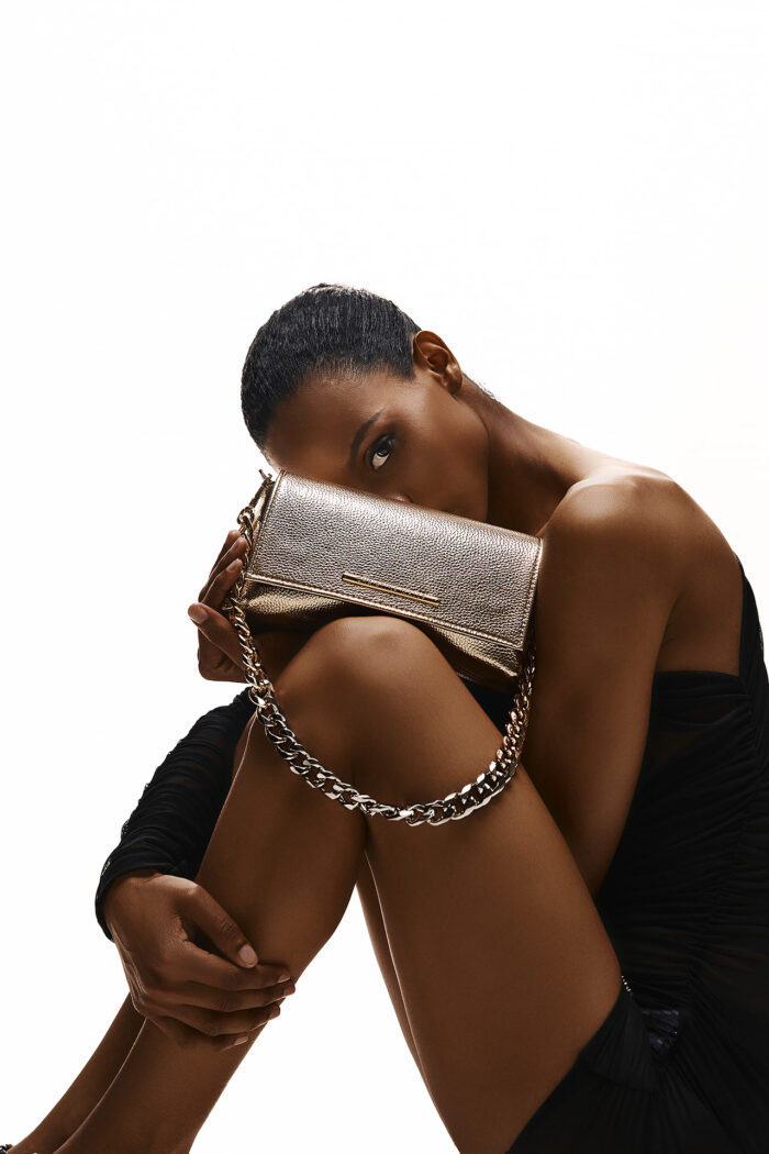 GΈχει δίχρωμη αποσπώμενη αλυσίδα για να κρατηθεί στον ώμο, αλλά μπορεί να κρατηθεί στο χέρι σαν clutch, προσφέροντας ευελιξία και στυλ σε κάθε εμφάνιση. Είναι η τσάντα που μπορεί να σας συντροφεύει σε όλα τα events.
